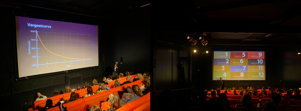 In zijn presentatie toont Tim een illustratie van de vergeetcurve van Herman Ebbinghaus en zegt “vergeten doen we allemaal”. Het publiek lacht. Natuurlijk wil iedere leraar dat kinderen onthouden wat er in de les wordt verteld. Maar wat is nou de strategie om te zorgen dat kinderen de lesstof niet vergeten? “Het is daarbij belangrijk om te weten hoe mensen dingen vergeten en onthouden”. Tim geeft twee voorbeelden en stelt het publiek de vraag wat zij denken dat de meest effectieve strategie is om kinderen iets te leren. De mening van publiek is verdeeld, maar er gaan veel handen de lucht in. Tims’ eerste reactie: “Mooi, iedereen denkt”. Het publiek lacht weer. Het antwoord? Je kunt de vergeetcurve afvlakken door de leermomenten te spreiden: “Herhalingsmomenten zorgen ervoor dat iemand iets trager vergeet”, aldus Tim.