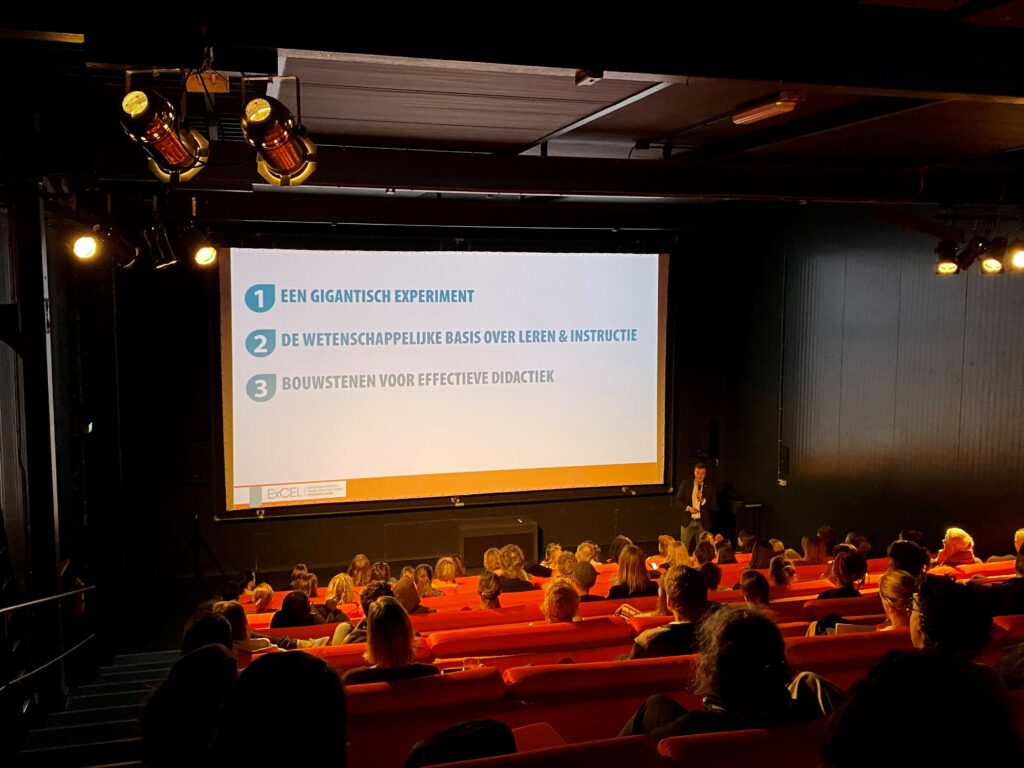 Het publiek oogt enthousiast en geïnteresseerd. Langzaam maar zeker loopt de zaal vol, er zijn ruim honderd aanwezigen, voornamelijk leraren, maar ook zijn er enkele schoolleiders en andere onderwijsprofessionals aanwezig. Om half 4 trapt Tim zijn masterclass af met een gigantisch experiment uit de geschiedenis.“De mens is heel zijn leven al aan te leren. Daarom de vraag: wat heeft ooit gewerkt en waarom?” We kijken naar project Follow Through: het grootste en duurste experimentele onderwijsproject dat ooit door de Amerikaanse overheid werd gefinancierd. Het project werd in 1967 opgestart omdat kinderen uit achterstandsbuurten gemiddeld ver onder het landelijk gemiddelde scoorden voor taal en rekenen. Het doel van het project was het vaststellen van de beste en meeste effectieve onderwijspraktijken voor deze kinderen. Wat bleek? Directe Instructie was het meest effectief! Een goede instructie van de leraar is dus cruciaal in het onderwijs. Tim geeft aan dat leraren er vaak vanuit gaan dat ze een goede instructie geven: “Het is zo vanzelf sprekend dat je ervan uitgaat dat het altijd aanwezig is in je eigen didactiek, maar dat is niet altijd geval”.